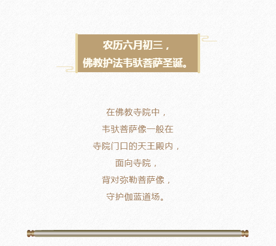 《大藏经》记载,韦驮菩萨常在娑婆世界,拥三洲大法轮,一十八世为将军身,五十四世为宰相,造亭接众一百二十所,开井一百三十口,造僧袈裟及碧树钵八百万,设僧尼浴池,砌大路四十八条,造佛寺四十六所。每世造旃(zhān)檀香佛一千尊,高丈六尺,每尊佛前造金宝塔一座,各高七尺,每世造《大藏经》一百藏,一十七世为真童身。